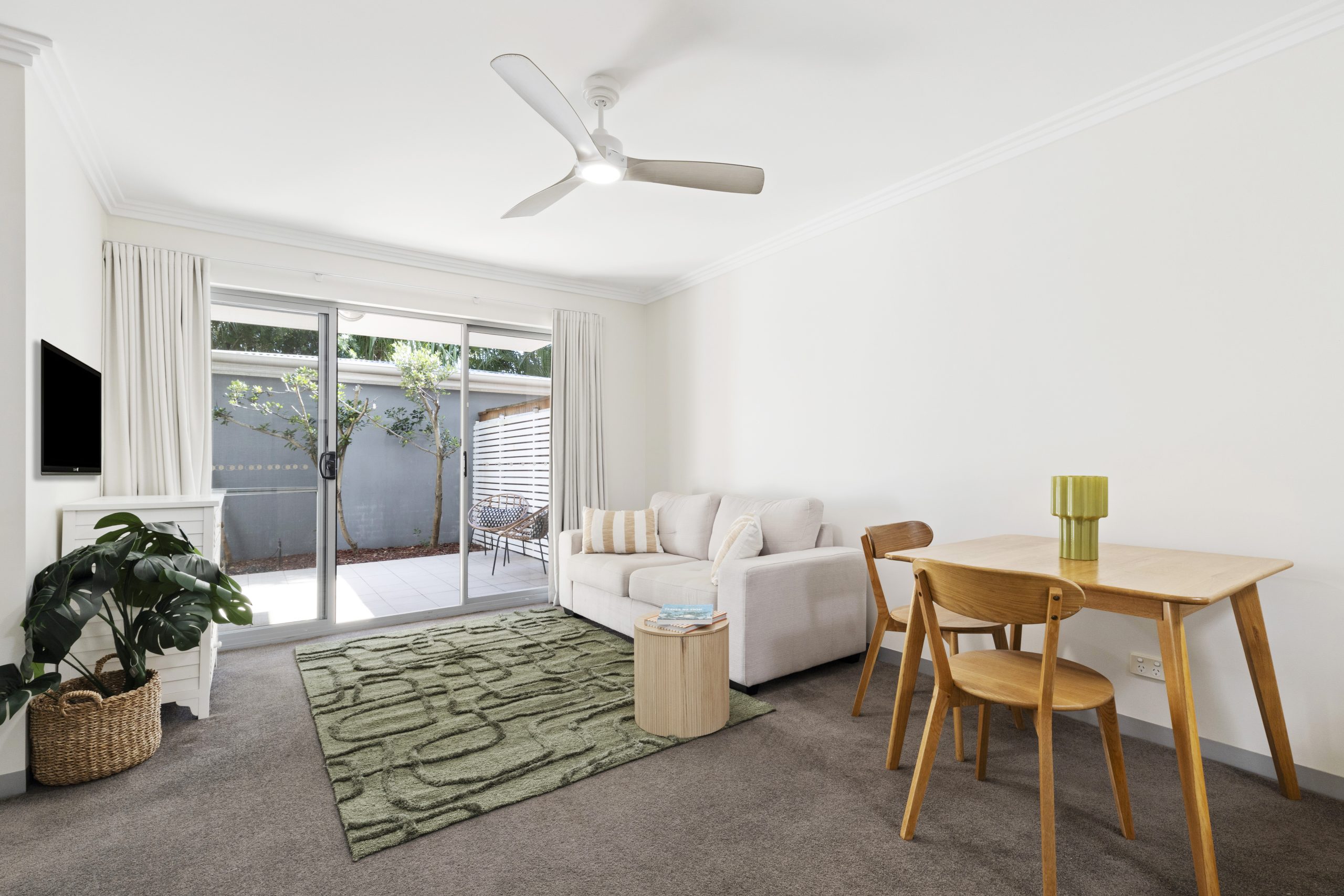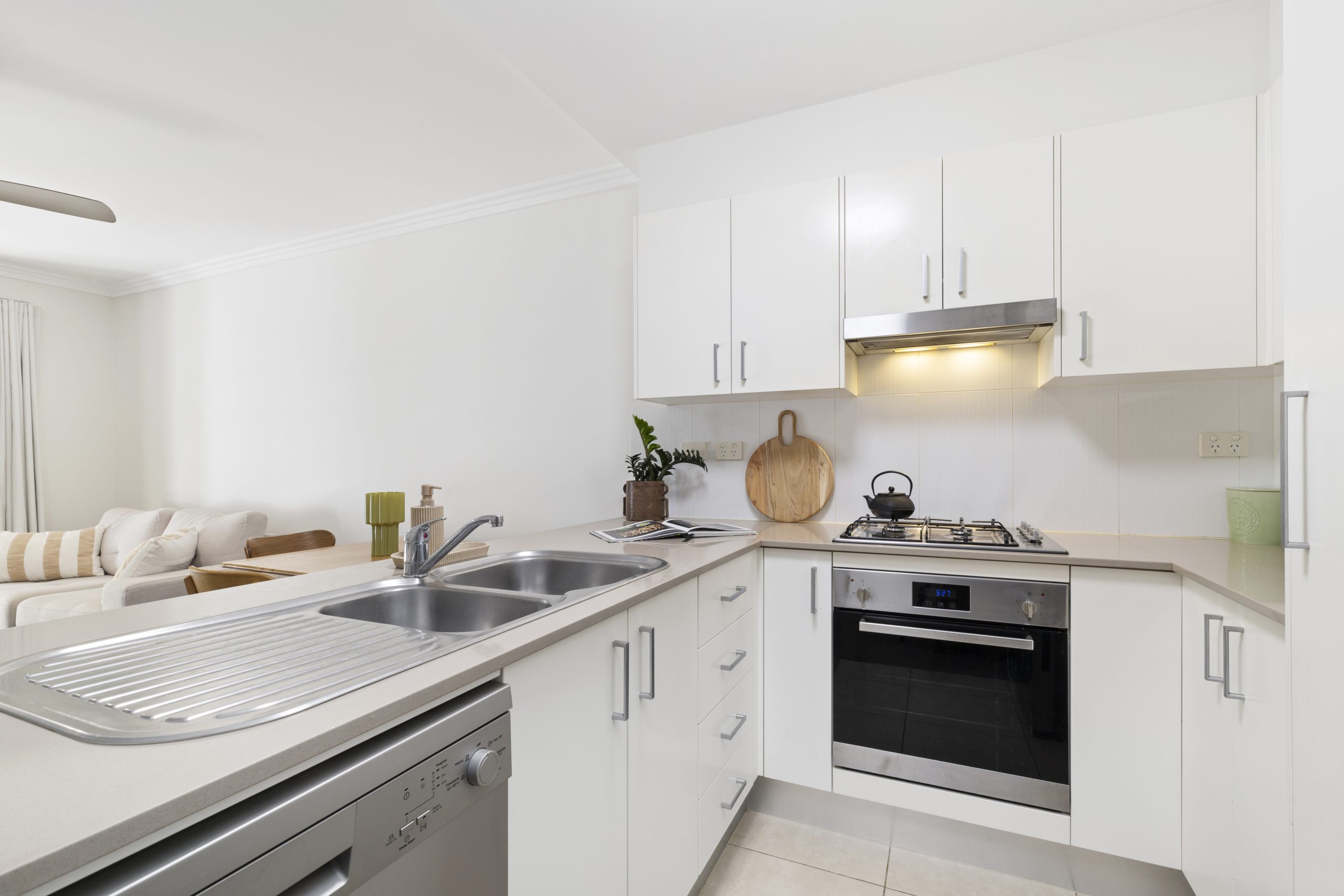 The spacious open plan living and dining area flows effortlessly to a generous courtyard, partially covered and enjoying plenty of afternoon sun—perfect for entertaining or relaxing in privacy. The modern kitchen is well-appointed with stone benchtops, gas cooking and a dishwasher, complementing the home’s easy, functional layout.