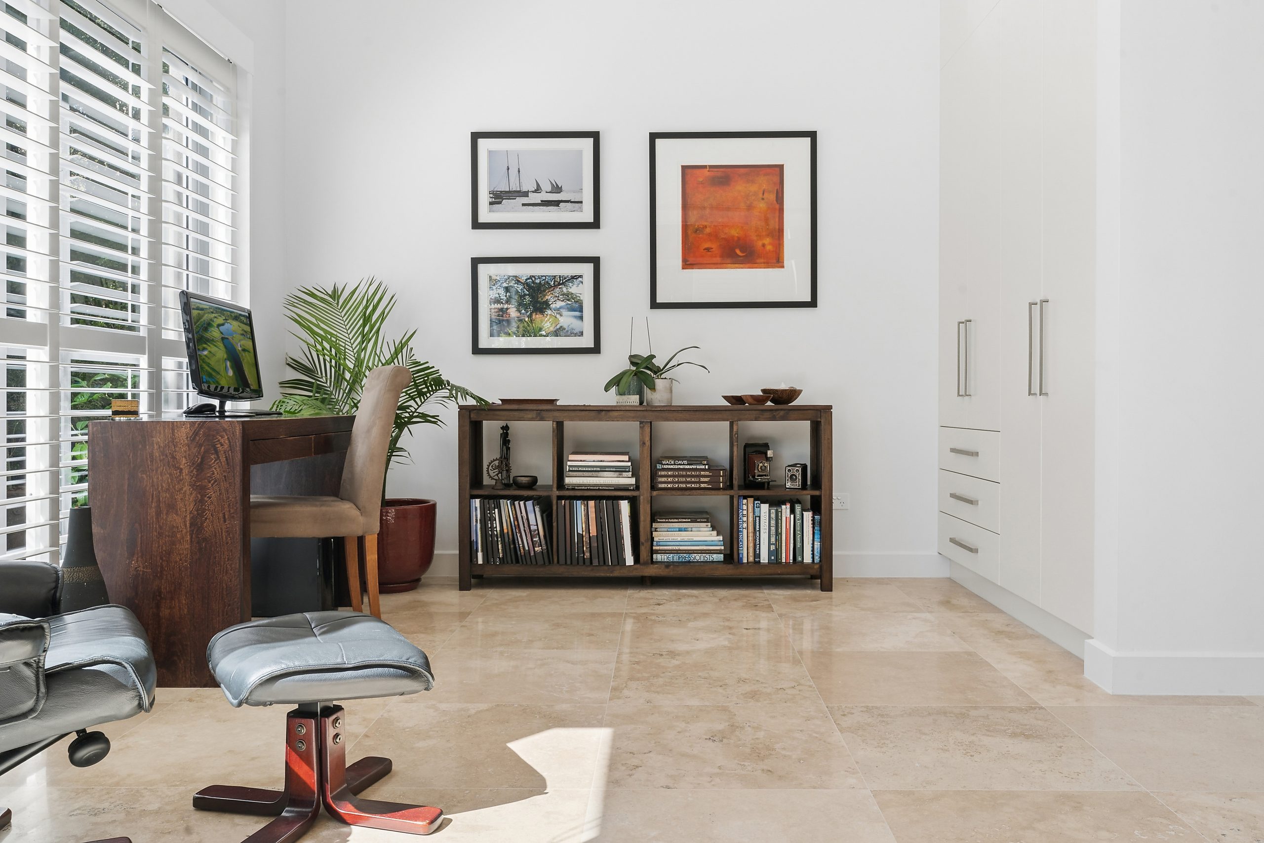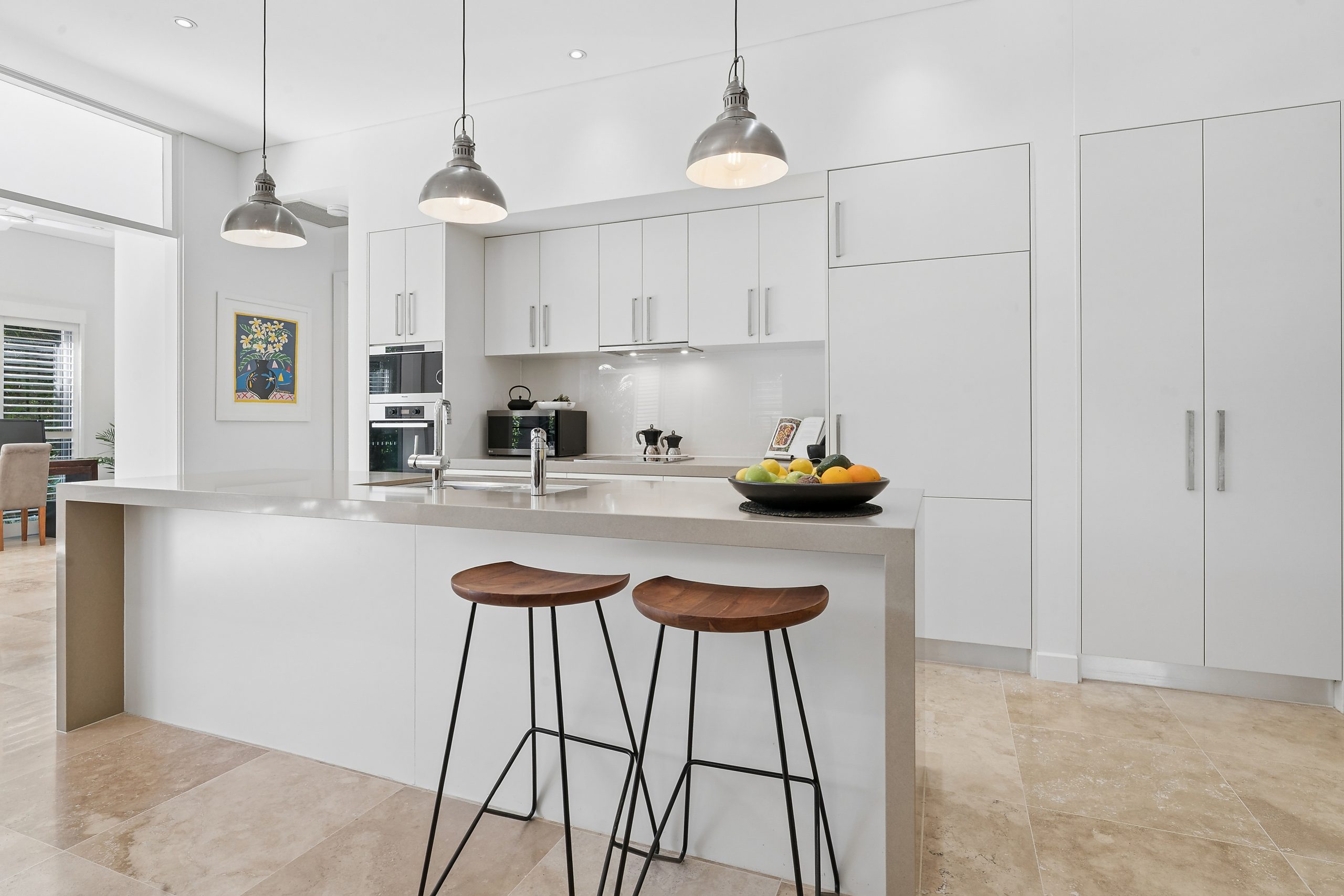 The designer kitchen complete with stone benchtops and full-length breakfast bar-island bench, includes a Zip hot & cold-water system, integrated refrigeration, and a full suite of Miele appliances.
